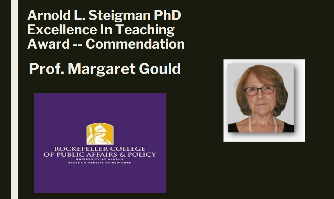 - Professor Margaret Gould – Rockefeller College of Public Affairs and Policy – Nominated by Dr. Julie Novkov, Dean
