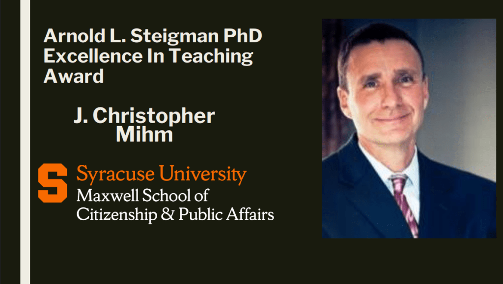 Congratulations to the 2025 Steigman Award Recipient, J. Christopher Mihm of Syracuse University’s Maxwell School of Citizenship and Public Affairs. Mr. Mihm was oversees and not able to receive his award at the Ceremony.