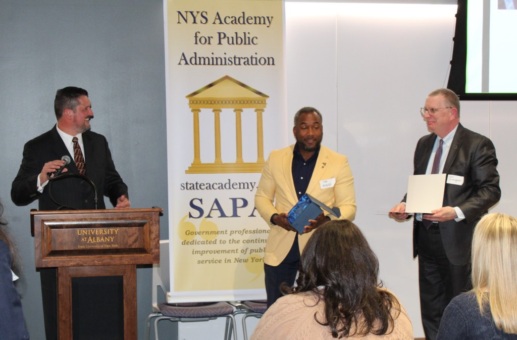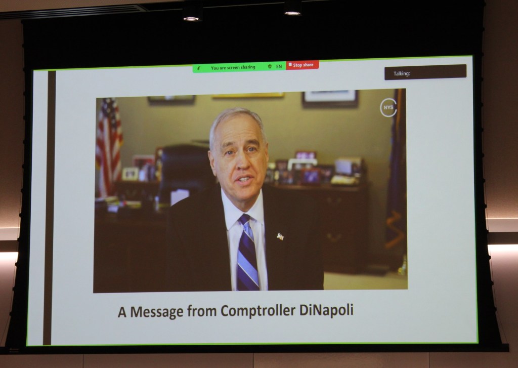 Chair of the State Academy’s Rockefeller Awards Committee, Sorelle Brauth, was honored to present the 2025 Rockefeller Award. Comptroller DiNapoli was unable to attend the award ceremony, but graciously sent an acceptance video. Jason Windsor, Comptroller DiNapoli’s Deputy Comptroller for Finance & Administration, accepted the award on his behalf.