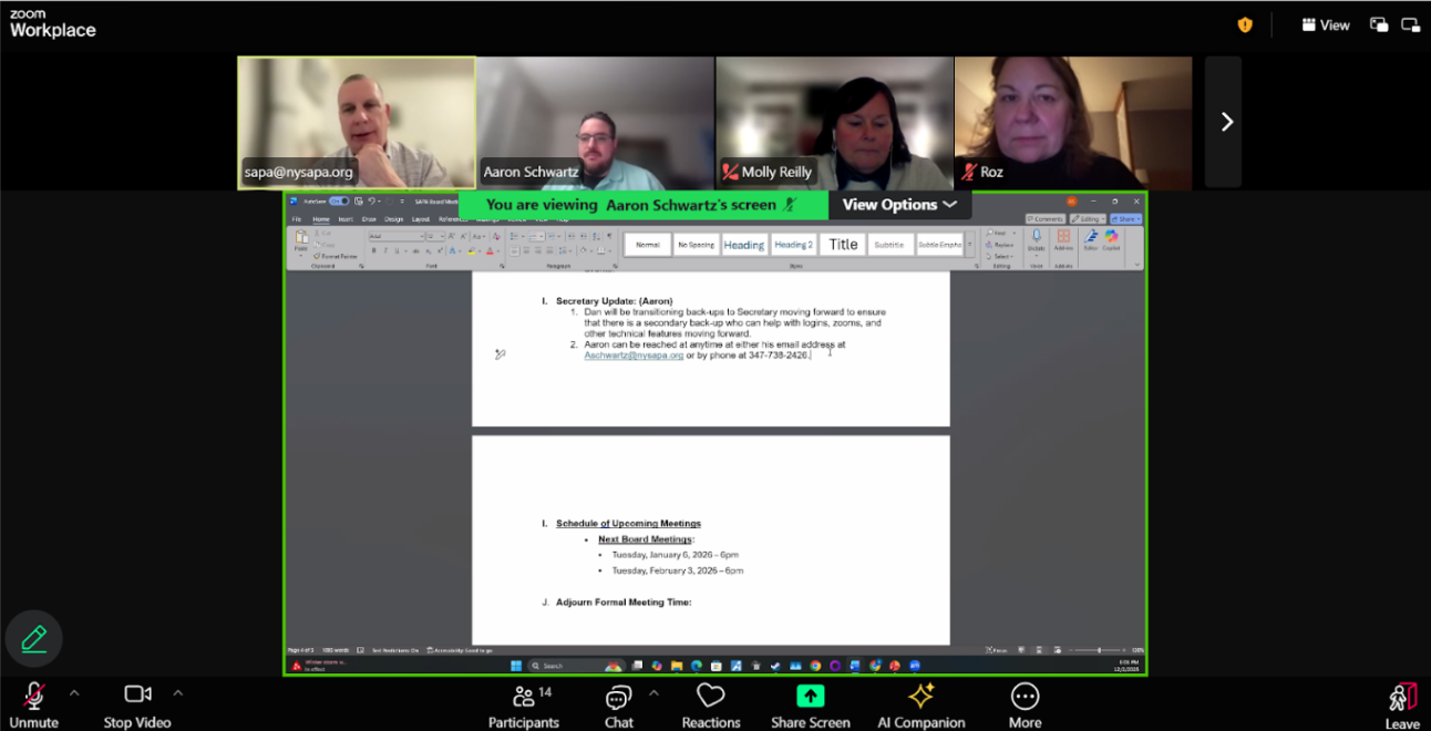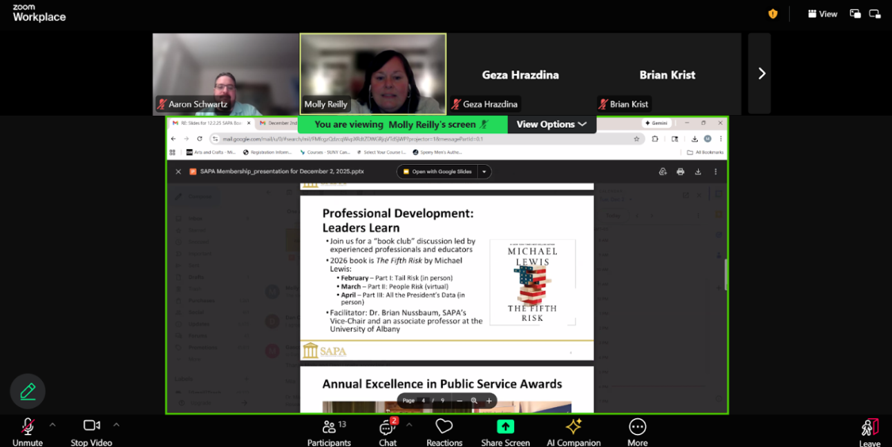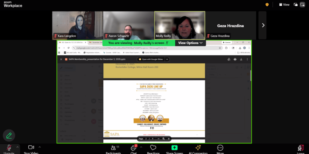 On December 2, 2025, SAPA Members joined the Board for our annual Holiday Gathering. Board President Dan Cunningham discussed the fantastic year of programming SAPA offered in 2025 while Board Member Molly Reilly presented the exciting 2026 lineup. 2026 will offer something for everyone – from networking and service events, to book and panel discussions. We look forward to seeing you – hopefully in person next time – at SAPA’s 2026 events!