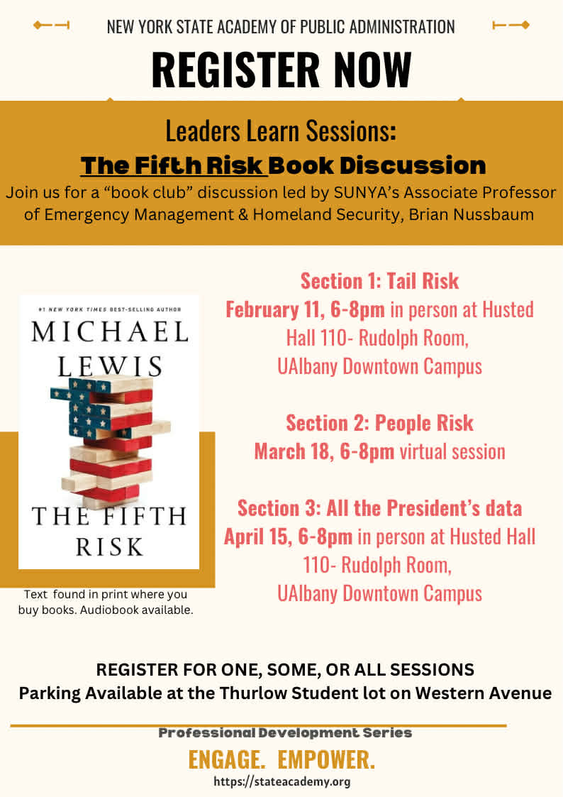 Back by popular demand, SAPA’s Leaders Learn “book club” for 2026 will discuss The Fifth Risk. Discussions will be led by SUNYA’s Associate Professor of Emergency Management & Homeland Security, Brian Nussbaum.